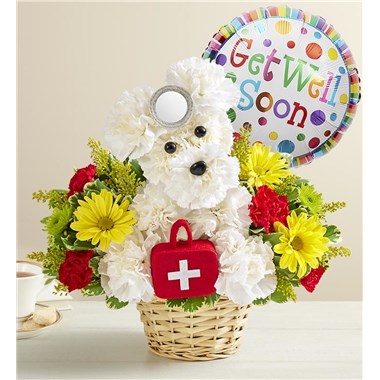 Our doggie doctor is the perfect pick-me-up for anyone feeling under the weather—and he loves to make house calls! From our signature collection, this cute creation is surrounded by a vibrant bunch of blooms, ready to brighten anyone’s day. Add an uplifting balloon to get them on the mend in no time.